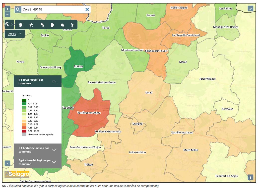 L'indice se rapporte aux seules surfaces agricoles de la commune, quelle que soit la part de la surface agricole du territoire communal. L'Indicateur de Fréquence de Traitement (IFT) correspond au nombre de doses de produits phytosanitaires appliquées par hectare pendant une campagne culturale. L'IFT communal correspond à la moyenne des IFT par culture. L'IFT total (hors biocontrôle) concerne tous les types de produits de synthèse (herbicides, insecticides, fongicides, traitements de semences, autres).