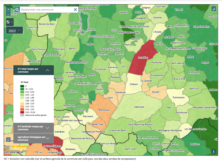 L'indice se rapporte aux seules surfaces agricoles de la commune, quelle que soit la part de la surface agricole du territoire communal. L'Indicateur de Fréquence de Traitement (IFT) correspond au nombre de doses de produits phytosanitaires appliquées par hectare pendant une campagne culturale. L'IFT communal correspond à la moyenne des IFT par culture. L'IFT total (hors biocontrÎle) concerne tous les types de produits de synthÚse (herbicides, insecticides, fongicides, traitements de semences, autres).
